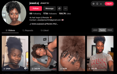 Jewel SJ is a brand I created in 2022. Jewel SJ promotes positive self esteem showing women of color the many ways they can style their natural hair. On my TikTok and Instagram accounts, I have reached national brands and managed to create multiple viral videos.